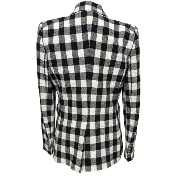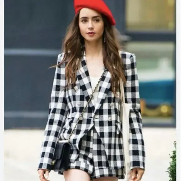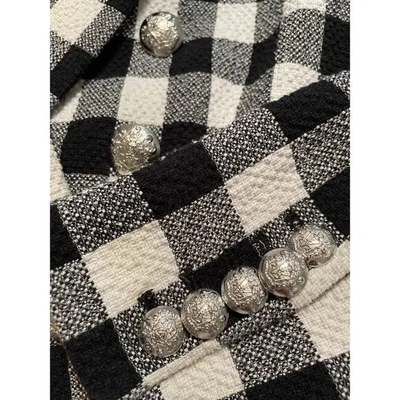 Gorge jacket famously worn by Lily Collins in Season 1 of "Emily in Paris," is a stylish and versatile piece. This features a classic black and white checkered pattern, a double-breasted front with elegant silver buttons, and a tailored fit that accentuates the waist. It includes two functional front pockets and is designed with the brand's signature dickey insert, allowing for versatile styling options. A must have for both professional and casual settings, this jacket embodies effortless perfection! Worn only three times. All measurements are approximate and do not guarantee a perfect fit. Coloration on pics may vary due to lighting. We attempt to inspect each piece carefully and note any irregularities in the pictures. Smoke-free, pet friendly home. Any item listed has been cleaned, washed, dry cleaned, steam cleaned, and any pilling or hair removed prior to shipping. Thank you for stopping by and checking us out. MC/9844