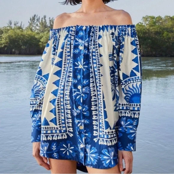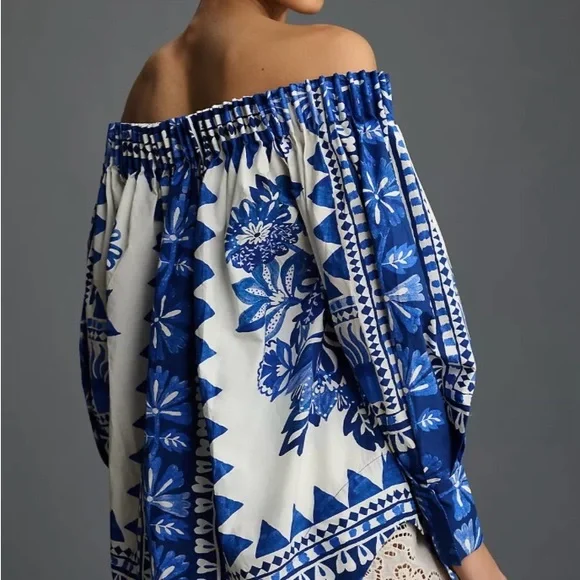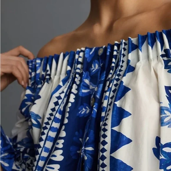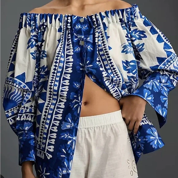 Stylish off-shoulder top featuring a vibrant blue floral pattern. Perfect for casual outings or a day at the beach.Embrace feminine elegance in the Off-White Flora Tapestry Long Sleeve Blouse. Featuring center front buttons and an off-shoulder style, this blouse has a delicate floral print that adds a touch of charm to any outfit. Perfect for any occasion, the long sleeves offer both comfort and style.MACHINE WASH, GENTLE CYCLE, DO NOT BLEACH, DO NOT TUMBLE DRY, LINE DRYING, IRON AT MEDIUM HEAT, DRY CLEAN WITH ANY SOLVENT EXCEPT TRICHLOROETHYLENESummer Floral Vacation Chic