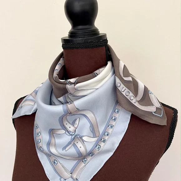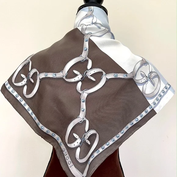 Authentic New Gucci Logo Chains Color-Block Silk ScarfNew with a tag 100% silk twillSquare shapeSize 27"x27" inchesHand-finished rolled edgesGucci Logo on the cornerStyle #233654Made in ItalyThe scarf will be wrapped with original Gucci tissue paperShipping Next Business Day. Usually arrives within 2-3 business daysHow to wear Silk Scarf:As a silk head scarf/bandana: tied around as a silk head wrap for a classic look.As a neck scarf: wear it around the neck - tie a bow or let the end hang loose. As a body accessory: wear around your wrist like a bracelet. As a silk belt: wear around high-waisted pants.As a silk scarf for bag: tie around or to the handle of your favorite bag for a classic look.Style it any way you want in your own mood and creativity!